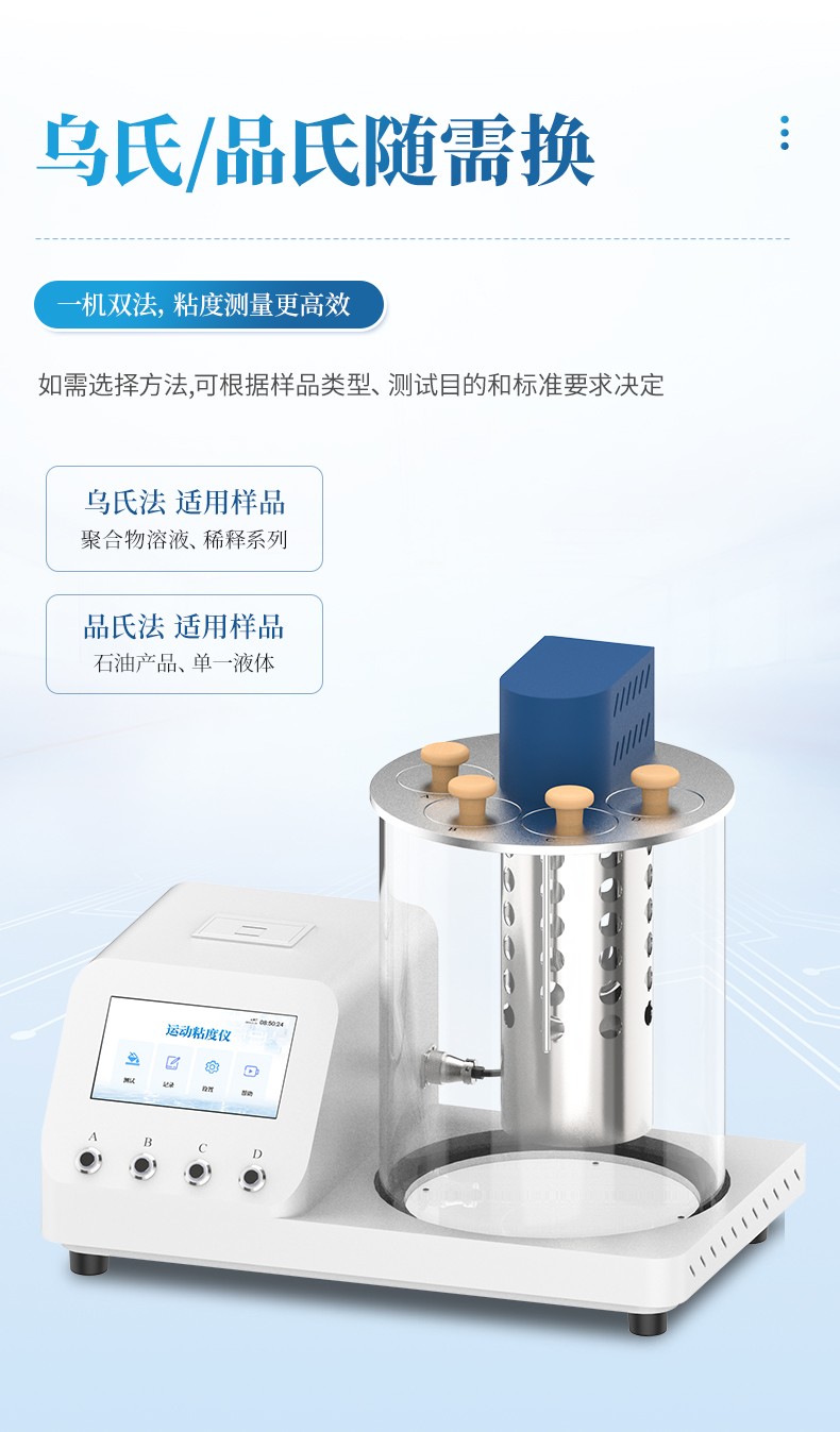 烏氏運動粘度計是依據(jù)國家標準《GB265-88石油產(chǎn)品運動粘度測定法》設計制造的專用測試儀器,適用于測定液體石油產(chǎn)品的運動粘度。本儀器具有計時試樣運動時間,自動計算運動粘度的最終結(jié)果。本方法適用于測定液體石油產(chǎn)品(指牛頓液體)的運動粘度,其單位為m2/s,通常在實際中使用為mm2/s。動力粘度可由測得的運動粘度乘以液體的密度求得。本方法是在某一恒定的溫度下,測定一定體積的液體在重力下流過一個標定好的玻璃毛細管粘度計(品氏、烏氏)的時間,粘度計的毛細管常數(shù)與流動時間的乘積,即為該溫度下測定液體的運動粘度。該溫度下運動粘度和同溫度下液體的密度之積為該溫度下的動力粘度。